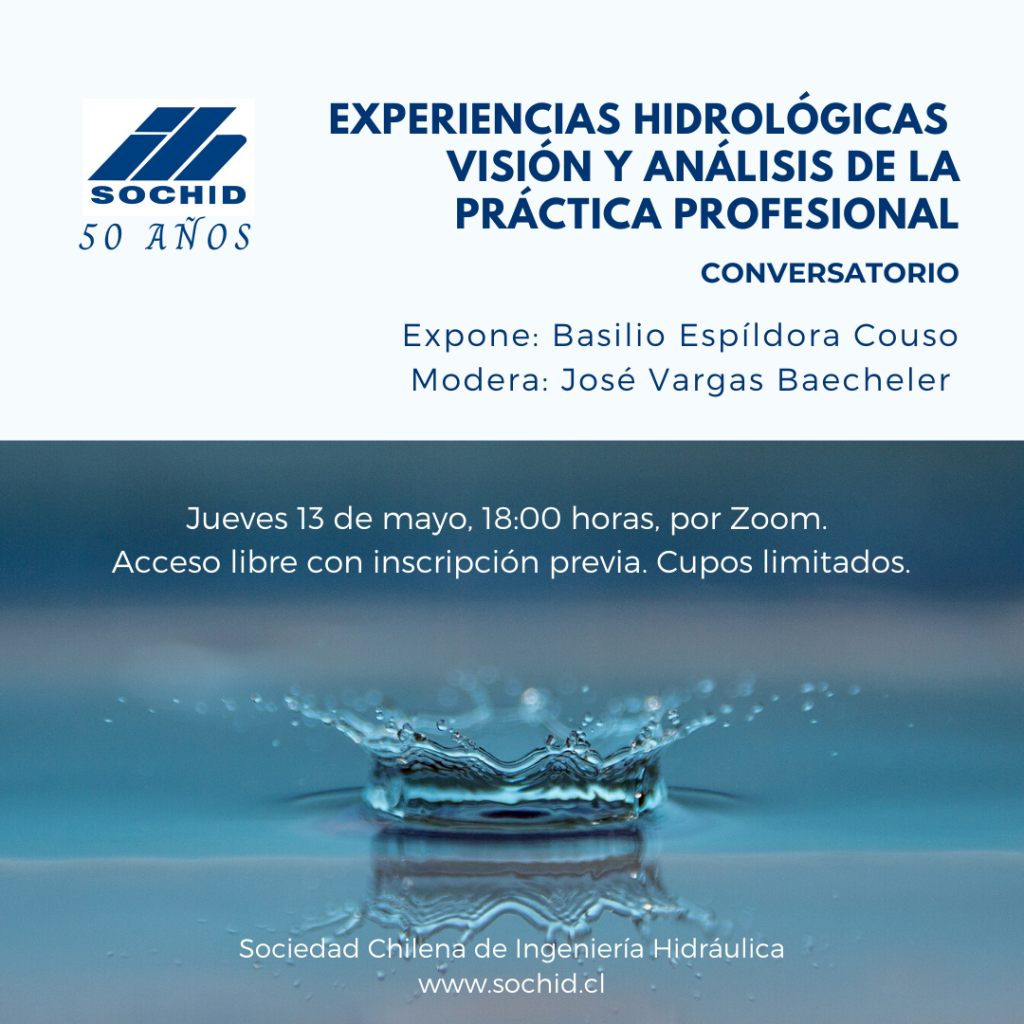 Con el objetivo de abordar problemas de interés general e incluso nacional, desde el punto de vista fundamentalmente científico y técnico, según se indica en los estatutos de Sochid, se ha organizado el conversatorio Experiencias Hidrológicas. Visión y Análisis de la Práctica Profesional, donde el ingeniero hidráulico Basilio Espíldora Couso comentará el libro del mismo nombre y de su autoría. Modera, José Vargas Baecheler, presidente de Sochid.
