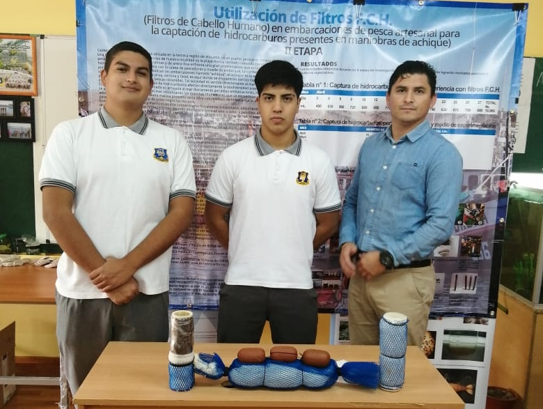 Primer Lugar: “Utilización de Filtros F.C.H. (Filtros de Cabello Humano) en embarcaciones de pesca artesanal para la captación de hidrocarburos presentes en maniobras de achique. II Etapa” de los alumnos Nicolás Sierralta V., Ferdy Hernández G., guiados por el Profesor: Sergio Julio G. pertenecientes al Liceo Manuel Blanco Encalada de Caldera, Región de Atacama.