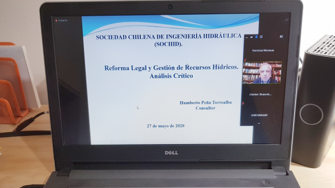 El miércoles 27 de mayo, se realizó la charla Reforma Legal y Gestión de los Recursos Hídricos. Análisis Crítico, del consultor y exdirector de la Dirección General de Aguas, Humberto Peña, para aportar a un debate informado tanto desde el punto de vista legal como de quienes trabajan en la gestión de estos recursos. Se trata de la primera actividad desarrollada por la Sociedad Chilena de Ingeniería Hidráulica (Sochid) a través de una plataforma virtual, la cual contó con la asistencia de cerca de 250 personas.