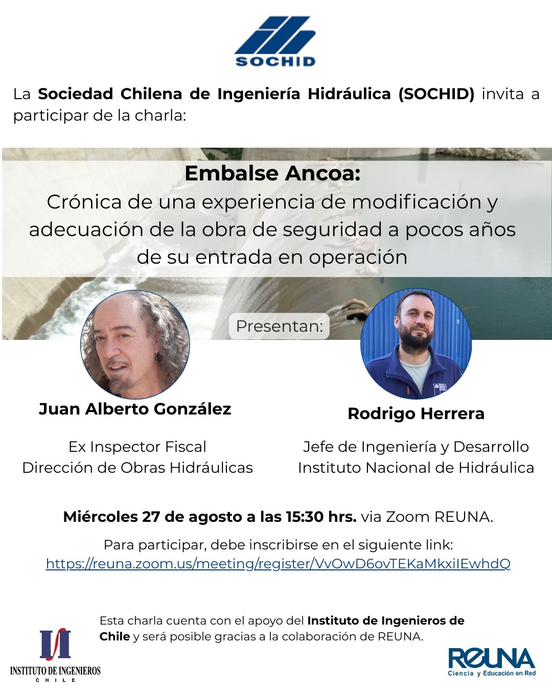 La Sociedad Chilena de Ingeniería Hidráulica invita cordialmente a la charla: «Embalse Ancoa: Crónica de una experiencia de modificación y adecuación de la obra de seguridad a pocos años de su entrada en operación», que se realizará vía Zoom el próximo miércoles 27 de agosto a partir de las 15:30 hrs.