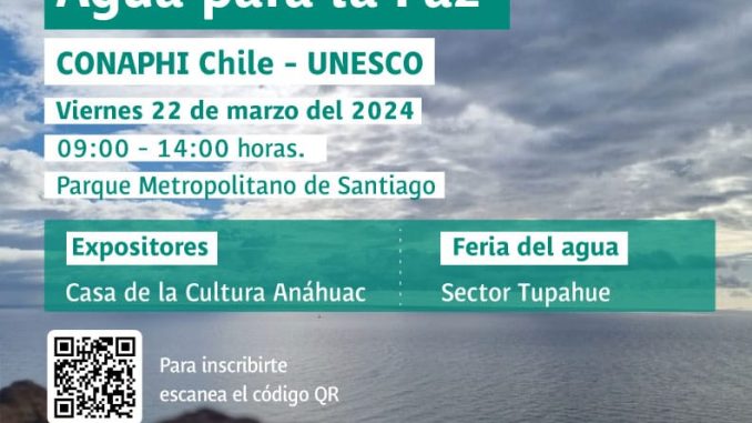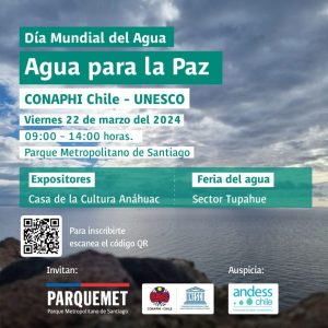 Con motivo de la celebración del «Día Mundial del Agua 2024», el Comité Nacional para el Programa Hidrológico Intergubernamental UNESCO (CONAPHI-Chile) invita cordialmente para el día el viernes 22 de marzo a partir de las 9:00 hrs. y hasta las 14:00 horas, a asistir a las dependencias del Parque Metropolitano, donde se realizarán varias presentaciones en el marco del lema de este año, «Agua para la paz». Habrá conferencias en la Casa de la Cultura Anahuac del Parque (el programa se enviará a la brevedad), y paralelamente, en el sector Tupahue, se realizará una «Feria del Agua», donde se encontrarán distintos stands institucionales, del sector público, privado y académico, relacionados con la gestión de los recursos  hídricos en Chile. En la Feria del Agua, el público visitante podrá disfrutar de nuevas experiencias y aprender más sobre el recurso hídrico, sus distintos ambientes y procesos, a través de maquetas interactivas, simuladores de acuíferos, realidad aumentada y virtual del agua, entre otras herramientas y exposiciones.