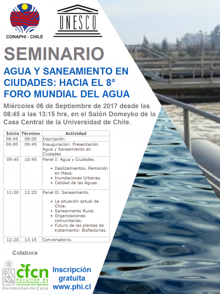 Carlos Estévez Valencia, Presidente del Comité Chileno para el Programa Hidrológico Internacional de UNESCO (CONAPHI-Chile), tiene el agrado de invitar a usted a participar en el “Seminario Agua y Saneamiento en Ciudades: Hacia el 8° Foro Mundial del Agua”, actividad a desarrollarse el día miércoles 6 de septiembre, a partir de las 8:45 horas, en el salón Domeyko de la casa central de la Universidad de Chile, ubicado en Avenida Libertador Bernardo O’Higgins 1058, Santiago.